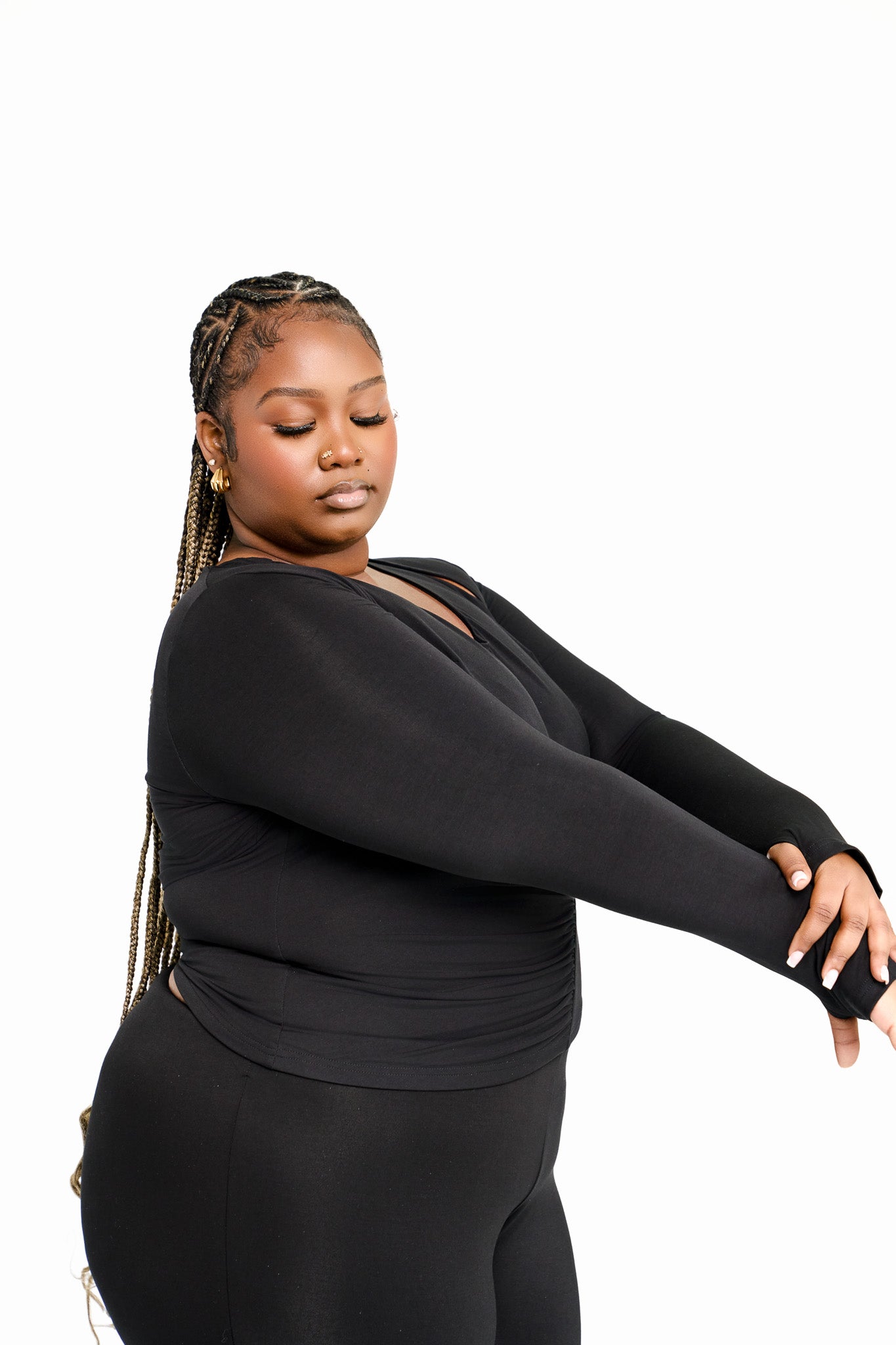 This fitted Aisha Bolero features long sleeves with thumb holes, providing a secure and comfortable fit that extends coverage and is an ideal layering piece for added style and functionality