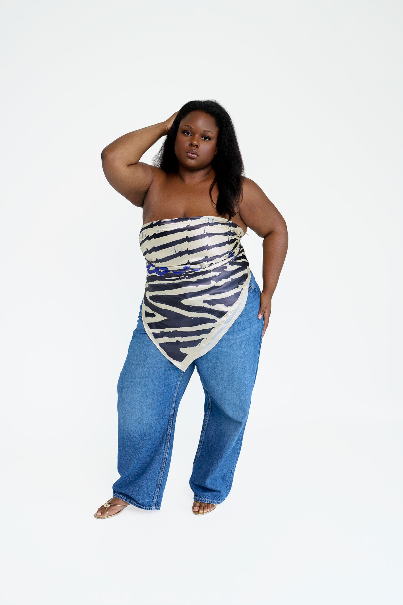 • Blessing has a 43 inch bust and is wearing the Medium size as a top and a headscarf